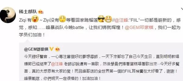 邓紫棋晒出获汪峰组学员庆生的照片,担任汪峰组梦想导师的她写到:“今天录好声音,一心专注当个好的梦想导师,一天下来都忘了自己今天生日,直到明明教唱环节已经结束了汪峰老师却说还有一首歌,然后学员们捧着蛋糕唱着歌出来?今天好多惊喜,真的太感恩有大家的爱!峰暴战队,你们明天一定很棒的!加油加油!”不过,最有趣的是,章子怡也转发了汪峰的微博,评论:“Ziqi有~Ziyi没有,等着回家跪榴莲。”因汪峰送给邓紫棋自己品牌的耳机。