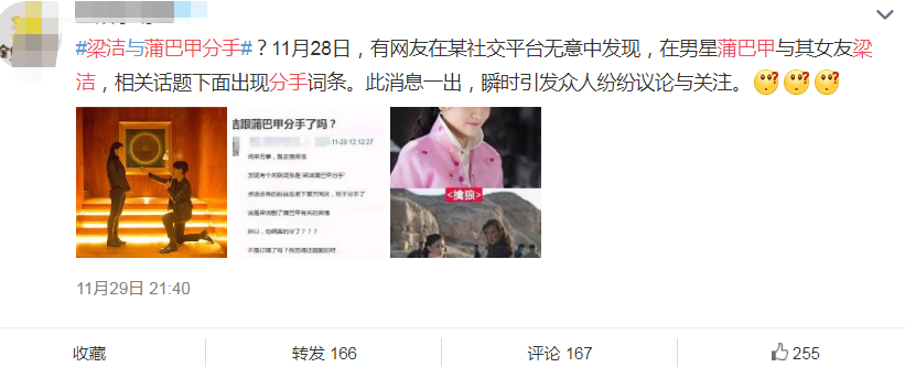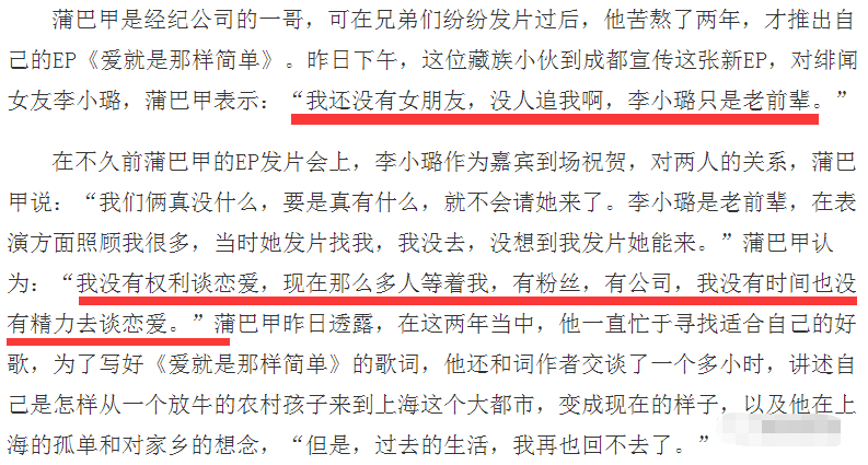 蒲巴甲到底有多强,曾把李小璐搞进医院…… 今日名场面 内地男星 2021-05-19 17:58:26 1812 创作不易,用心坚持,欢迎请BaGua喝几杯爱心咖啡!打赏并支持本文 打赏并删除本文 昨天蒲巴甲和梁洁官宣分手了。两人听起来都挺糊的,但是这一分手,倒是牵出了一段故事来。这两个人2017年就在一起了,梁洁是94年的妹子,比蒲巴甲小9岁。2017年的时候因出演了《双世宠妃》而爆火,但是呢这姑娘事业心不咋强,在这关键的事业攀升期不炒cp,跑去谈恋爱去了。2017年7月,她和蒲巴甲被拍到约会,当街亲密合影,恋情实锤。到了第二年2018年2月,蒲巴甲便宣布向梁洁求婚成功,并用藏语表白,异常甜蜜。不过在娱乐圈这种地方,求婚不代表什么啦,毕竟结婚了都可以离婚,离婚了也可以复合,在这里,一起皆有可能。就像这一对,至少在半年前,两人就已经分手了。去年11月,有人发现梁洁把三年前蒲巴甲对她求婚成功的微博删除,就猜测两人感情有可能生变。而两人昨天约好了时间发微博官宣,互送祝福,看起来很是体面。然而声明发出去没多久,媒体就爆出蒲巴甲和一金发女子一起进酒店吃饭。这一前一后,像是算好了一样,你品你细品……两人公布分手之后,网友纷纷放鞭炮恭喜美女。为什么呢?原因就是蒲巴甲身上故事实在太多了!不知道有多少人还记得,蒲巴甲和马天宇是同一届,都是《加油好男儿》出来的,而蒲巴甲还是那一届的冠军。而那一届,现如今混的最有名气的还是马天宇。而他本人最大的特点,就是,长得特别特别特别像王力宏,堪称“王力宏藏族分宏”。再加上一个李治廷,仨人站在一起,几乎可以被消消乐一键消除。蒲巴甲一开始很排斥别人说他像王力宏,后来过气了,又上《百变大咖秀》模仿了一把王力宏,啧。还有一个冷门知识点,他和林更新是大学同学,选秀出名后,考了上戏表演系07级。很多人以为蒲巴甲拿下《加油好男儿》冠军后,就糊了。其实也算不上,他是属于闷声发大财的那种。选秀出道后,蒲巴甲立即就拍了一部很适合少数民族身份的电影《喜玛拉雅王子》。参加了美国洛杉矶国际电影节,获金天使奖。2008年,蒲巴甲还当选北京奥运会火炬手,参与上海奥运火炬南京路传递。而且这么多年来,戏约不断,还拍了不少主旋律的片子。而且据网友爆料,蒲巴甲在北京六环有上千平的独栋别墅,装修还很有品位。有钱真好!有点小名气,有钱,有别墅,这样的的舒适生活谁不羡慕呢,也难怪梁洁在事业发展的路上选择了安稳恋爱。话说蒲巴甲和梁洁结缘于一部戏,2015年9月,蒲巴甲拍主旋律戏《擒狼》,而梁洁是N番女配。但因戏生情这事儿,对于蒲巴甲来说太家常便饭了,网友调侃他拍一部戏换一个未婚妻。2009年,《战北平》拍摄期间,频频传出蒲巴甲和李小璐的绯闻。合作以后,经常会有一起的采访等等之类的活动,两人互动挺频繁,也就是那段时间,狗仔经常拍到他们一起出来约会。但蒲巴甲对于这段绯闻是否定的,称李小璐是老前辈,自己有粉丝,没精力谈恋爱……然而打脸的是,到了2009年9月份,有游客拍到李小璐和蒲巴甲同游马尔代夫。而且游客还看到他们牵手拥抱了……当时还有一个新闻,有网友爆料,说看到李小璐在中日友好医院手术,说她宫外孕。后来李小璐的父亲大骂传谣的人是流氓,而李小璐也澄清是因为自己不是宫外孕,而是黄体酮破裂,这才去的医院。虽然李小璐对此做出了解释,但网友们却不太相信。李小璐黄体酮破碎和宫外孕的传闻被大家联系起来,到底事实如何大家真不清楚。不少人都觉得是蒲巴甲身体素质太好,李小璐才会受不住,因此这段桃色传闻一直流传于坊间成了一段隐秘的梗。随着蒲巴甲匆匆赶往下一个剧组,蒲巴甲和李小璐的故事就此结束了。2013年底,蒲巴甲和徐冬冬一起出演了《第一伞兵队》,也是搭档情侣。徐冬冬大家都知道吧,就是《余罪》里面那个波涛汹涌的大嫂。也是同一年,蒲巴甲还自己当编剧当导演执导了微电影《信之旅》,捧自己的女友。2015年初,两人一起登上央视国际情歌大汇节目,十指紧扣表演了情侣对唱曲目《想把我唱给你听》。而有趣的是,同一个时段,杨幂和刘恺威也在芒果台跨年演唱会上合唱了这首歌。这首歌可能有啥特殊的魔力,似乎昭示这他们两对之后会有一些特别的联系……2015年6月,蒲巴甲求婚徐冬冬、两人疑似已在蒲巴甲老家结婚的照片刚刚曝光。然而照片和消息刚爆出来,徐冬冬突然发博说和蒲巴甲分手了。为什么突然就分了?徐冬冬的闺蜜姜欣雨出来大骂蒲巴甲,说他是渣男,明明两个人是奔着结婚去的,结果却背着女朋友偷情。不久之后,记者追问蒲巴甲是不是跟徐冬冬求婚了,他矢口否认,连两个人的恋情一并否认了。他还反问记者,“你确定是我吗?”呵!有意思!照片里不是你是谁?难不成是王力宏或者李治廷替你求的婚?就离谱……那插足徐冬冬和蒲巴甲恋情的三儿是谁呢?起初,这个第三者被指向了王鸥。理由是,在徐冬冬和蒲巴甲恋爱期间,王鸥曾在合作期间跑到蒲巴甲的休息车上录小咖秀,称对方“这是我老公”。这两人确实合作过一部戏,是一部抗战片,叫《热血之共赴国难》。拍摄期间,王鸥微博还发过两人的合照。还有一个被怀疑是小三的就是王力可。2015年6月16日,媒体拍到蒲巴甲和王力可在咖啡馆热聊。有意思的是,接连换了三个女主角的绯闻故事,全都发生在2015年。捋一下时间线:2013年