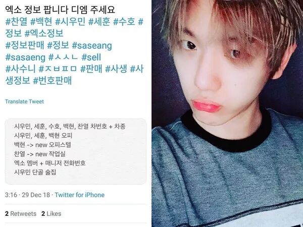 有一个社交网站账号在网上贩卖EXO成员消息,写着“贩卖EXO个资,请私信”,除了EXO成员们与经纪人的电话号码、经常光顾的居酒屋,情报内容甚至广泛至Xiumin、世勋、SUHO、伯贤与灿烈的车牌号码与车种,还有Xiumin、世勋、伯贤的住所,包含伯贤新公寓、灿烈新的工作室!