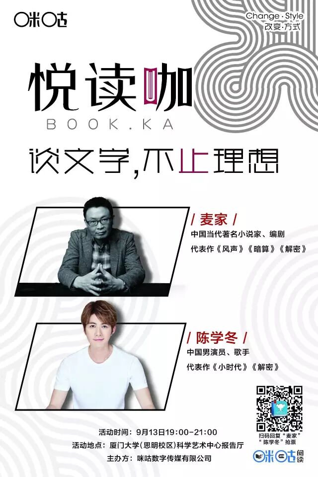 “悦读咖——谈文学,不止理想”是咪咕阅读为麦家量身打造的活动,“我们的文学似乎正在渐渐边缘化”,所以,他邀了5位朋友,到访5座城市,打算好好聊聊文学。阿来、苏童、李敬泽、马家辉,陈学冬在里面显得格外突兀,但麦家说,他是少见的对作品怀有如此敬意的年轻演员,他可以让更多年轻一代关注现在被看来缓慢而笨拙的文学。