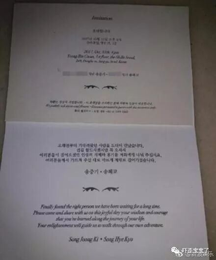 最近宋仲基、宋慧乔的婚礼现场图曝光,婚礼地点选在首尔新罗酒店,网友表示现场美的可以拍韩剧。此前,双宋夫妇婚礼喜帖也曝光了,内部文字:终于等到对的人。