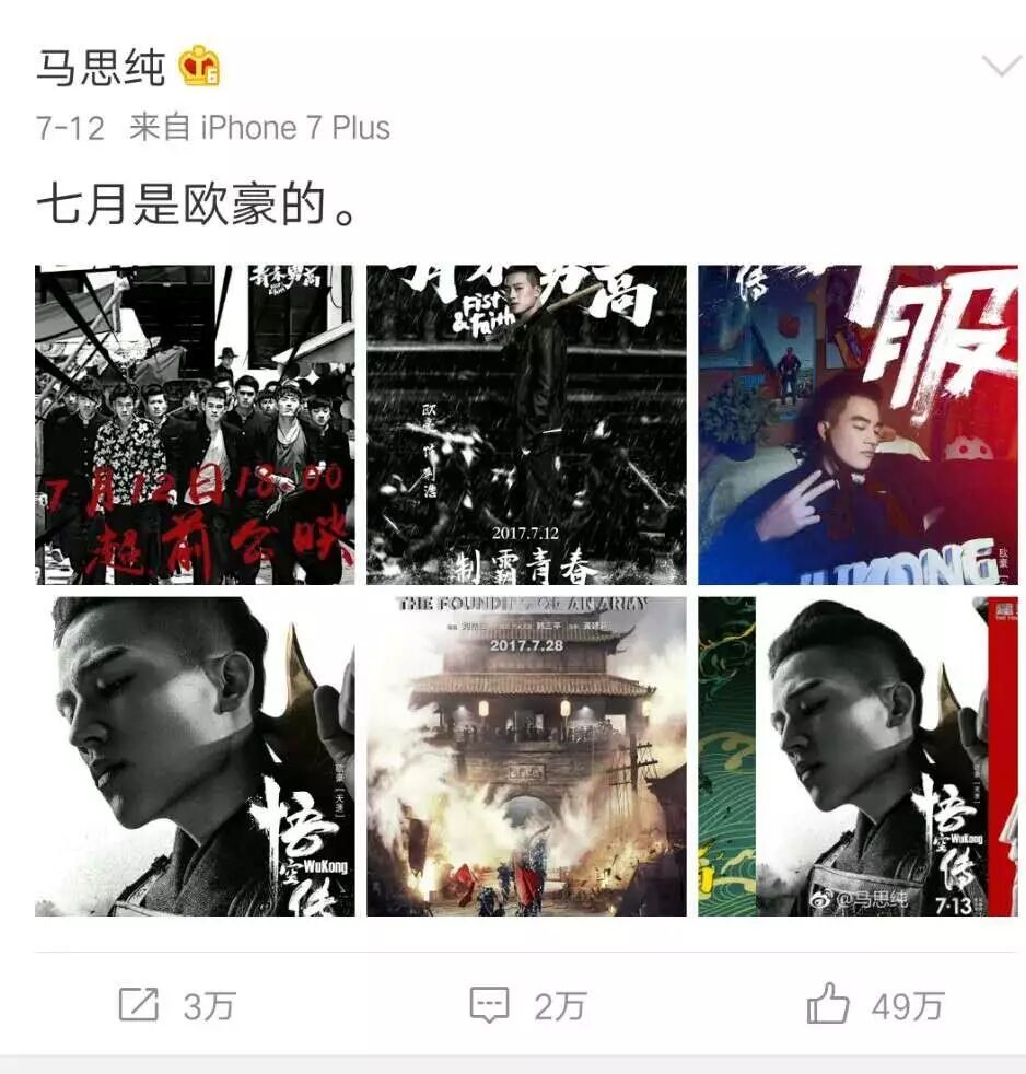 马思纯仅仅只用了六个字就甜倒了一大片。她发了条微博:“七月是欧豪的”,前提是她在《七月与安生》饰演七月,所以这句话翻译过来就是——“马思纯是欧豪的”。