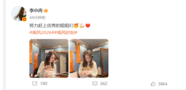 据了解,4月17日播出的《乘风2026》节目中,李小冉回应《心愿便利贴》一公个人乘风值第一名,她哽咽称:“我们的起跑线就是很低,我希望我们以后的舞台是可以向唱功好、跳得好的姐姐们看齐”,还表示可以承受更多的东西。