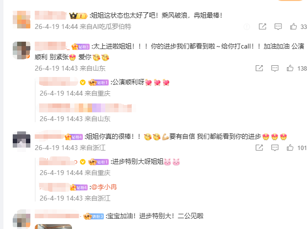 对此,有网友评论说:“姐姐这状态也太好了吧!乘风破浪,冉姐最棒”!还有网友说:“太上进啦姐姐!!!你的进步我们都看到啦~给你打call!!加油加油,公演顺利,别紧张”。