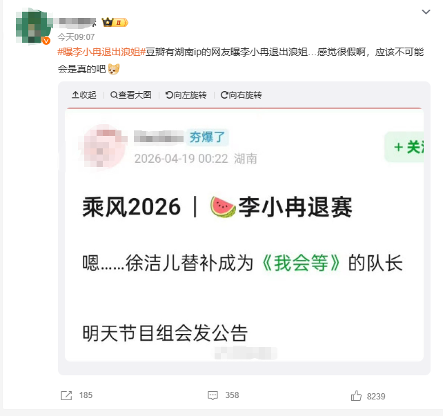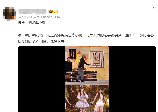 今日(19日),有多位网友在社交平台发文:“曝李小冉退出浪姐”。