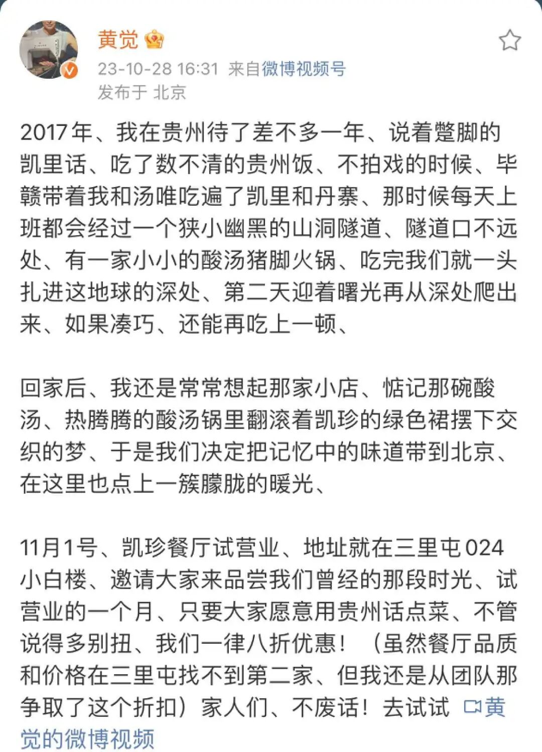 餐饮大亨黄觉 X博士 内地男星 2023-12-07 13:52:17 285 创作不易,用心坚持,欢迎请BaGua喝几杯爱心咖啡!打赏并支持本文 打赏并删除本文 编辑、策划:润发全北京的时髦年轻人都往黄觉碗里扎堆儿呢。上周末,上海的厚米来北京,别的没干,俺俩花了四个小时吃饭。我寻思也算是来自大城市的都市丽人,咋就哭天抹泪喊着要吃黄觉新开的贵州菜,上海青年文化不挺支棱的嘛,就这点儿出息啊。人家当场给我上了一课,说现在没吃过黄觉餐厅的都成土鳖了,直接被文艺界扫地出门,再安个防盗门上八个锁。以前是你不给大冰老师开门,嫌装不下那老多人,现在大冰老师都不给你开门,属于开除文艺籍,留校察看。我再一看老狼和汤唯都去打卡了,黄觉自己也总在店里晃悠。这热闹得凑啊,快到碗里来,你才到碗里去。 地球最后的贵州菜黄觉新开的贵州餐馆名叫「凯珍」,和《地球最后的夜晚》里女主同名,意为“凯里的珍珠”,地点就在三里屯024小白楼一层。觉宝微博里给家人们解释了开店原因,拍《地球》的时候搁贵州待了一年,吃老多贵州菜,回北京之后就想着那一口。而且毕赣是贵州人,也是凯珍的股东。凯珍的菜单都是毕导手写的(我没摸到,我扫码点的)。餐厅门口的街道整得像朝阳区灯光秀一样,树上挂的是蓝紫色小鱼形状的灯。文艺男女走这路上可有话唠了。文艺男:张雨生唱《一天到晚游泳的鱼》,我即兴创作《一天到晚上树的鱼》。文艺女:那我出个脑筋急转弯,树上qi个鱼,地上一个鱼,拢共几个鱼。「凯珍」被一片芦苇荡包裹着,离老远一看就有网红文艺餐厅的氛围感了。我上次见这老多芦苇还是在《小兵张嘎》里的白洋淀,嘎子哥见了都得拍大腿:这芦苇氛围感我卖货时候咋妹想到捏。进去现场扫码排号,不支持网上预定,下午是5点开门,店里一共10来张桌子,我周日5:50到的,前面40来桌,且等着呢。等位时候我做了三件事:·逛了024小白楼。二楼是说脱口秀的;三楼有个挺赛博朋克的银色系厕所,女卫生间没蹲便,男厕所我没进。·步行去三里屯北区溜达了一圈。挺萧条啊,看出来消费降级了,周日晚上都没几个人逛街,人最多的地儿是BC门口,全排队买面包呢,马斯洛诚不欺我。·回到凯珍等位,赶上了现场打碟音乐会。太亚了,以前等位顶多吃点小零嘴儿,现在都能看现场了。扫了一圈等位的朋友们,北电中戏大羽绒服造一堆,群英荟萃,俊男靓女等位,一水儿北京文艺逼平均脸。好几个DJ抓了好几个beat。心一跳,爱就开始煎熬,每一分每一秒,终于到我了。店里装修是简洁工业风,边边角角也有芦苇点缀,随手拍个小?都挺出片儿,这环境太适合咱文艺逼约会了。你说咱和文艺男约会,下午你俩搁小西天看个电影,再citywalk到三里屯逛游。一路上他使用海量专业名词分析了几大导演意味不明的长镜头,又背诵了B站UP主的万字电影解析。房间里的大象说了两次,解构主义和齐泽克提了三回,性压抑讲了六遍,连他发小和毕赣握过手你都听八轮儿了。眼瞅着中国电影之困局都快被他整成期刊论文了,他扼腕叹息八百次,口也干了肚也叫了,你耳朵上的茧子都能保暖了。最后他问你刚刚电影咋样,你说没看懂。他尴尬一顿又神秘一笑说:没看懂是一种幸运。你实在不知道接啥话,这天聊得死去活来、起死回生的。你说吃个饭吧。吃啥呢?吃西餐略显老套,涮肉羊蝎子少了腔调,咱正宗老北京外地文青,就得去逛觉宝新餐厅。中国版《花束般的恋爱》都能在凯珍取景,等位的时间比正好方便你俩交换豆瓣片单、网易云收藏,再听他聊两遍原生家庭的伤痛。等了那么久,必须急头白脸造一顿,一看价格真不贵啊,人均一百出头,这在三里屯还要啥自行车。我和厚米报复性点单,花了400,其实这都够仨人吃了。招牌菜我个人最喜欢虾酸牛肉、贵阳怪噜饭和红酸汤鱼,吃上感觉不背几首“小鸟在我胸口跳伞”都说不过去。总的来说是上菜快,品控好,吃的我肚子咕噜饱,没吃上猪脚酸汤锅,本周再去换几个菜尝尝。觉宝挺行啊,一个演员不看剧本看上菜谱了,这回真成餐饮大亨了。餐饮大亨黄觉明星开店的其实也不少,但生命线都不咋长,要么就是品控不过关粉丝都不买账,要么干两年就悄无声息倒闭了,更新换代比内娱本身都快。但黄觉干餐饮真挺不一样,挺能开,还挺会开。黄觉有家酒吧Mandrill,在丽都将台路那一片,北京颇像上海的洋气地儿。在2018年宣传《地球》的时候他就办过请喝酒的活动。整得跟我东北老家二大爷似的,就好请人喝酒,二大爷喝完还得扯几句拜登。觉宝属于文艺挂,实在广西人,一口闷下“地球最后的夜晚”,再念念杯底的:你数过天上的星星吗?它们和小鸟一样,总在我胸口跳伞。录个视频艾特他,这酒就免单。那阵子窦靖童、廖凡、李诞各大明星网红都去打卡,潮男靓女亚庇文艺逼也都往那儿跑。微博上一刷都是喝酒视频,整得像千禧年前后北京文艺乌托邦,谈笑有鸿儒往来无白丁。“地球”那酒我喝过一次,挺烈,但喝完还能走直线。里面挺多酒都是电影命名,江湖儿女、地久天长、过春天啥的,酒杯对应着酒设计的都挺讲究。江湖儿女是豪放派瓷缸子,过春天是白瓷盅配小酒杯,一个像辛弃疾,一个像李清照。上次去喝了个东方智慧,老大一杯,味道很淡,喝完好像搞老庄了。还出了个粉嫩的“燃冬”,想三人行的朋友可以和搭子去品品。就是还没“宇宙探索编辑部”,感觉这电影和Mandrill挺搭。
