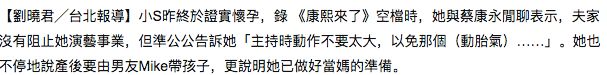 最终在6月中旬录制康熙的时候,发生了忘记关话筒事件,小S和蔡康永在后台的对话通过话筒传递给了现场的每一位工作人员,怀孕的事情得到了印证。