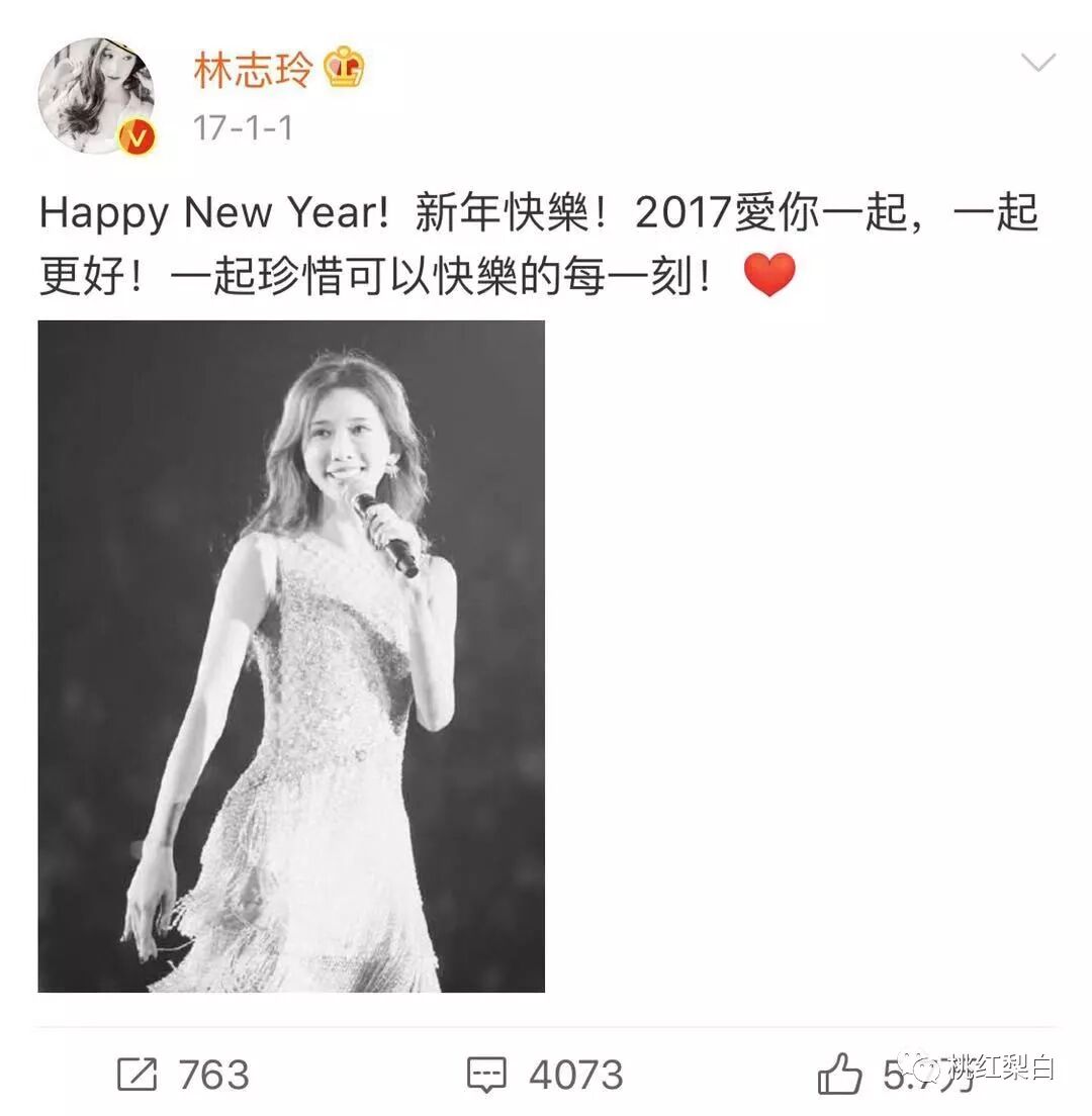 她发了一条“示爱”微博,配文写着:Happy New Year!新年快乐!2017爱你一起,一起更好!一起珍惜可以快乐的每一刻!