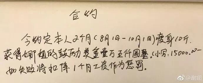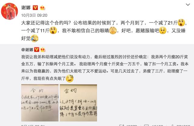 在表示表弟已经减肥成功后,谢娜又晒出了表弟的前后对比照,并发文:“我表弟,不是那天做饭那位,是和我打赌两个月减肥20斤,最后成功赢得5万奖金那位,减肥前和减肥后照片对比。广告词:每天少吃一块肉,今年维秘你走秀”。
