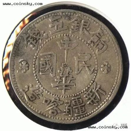 (8)喀什民国饷银五钱,喀什于民国二年至五年铸“饷银五钱”,并采用阿文纪年。钱币正面字全为汉文,中间珠圈内为“中华民国”,圈外上方为“饷银五钱”,下方为“新疆喀造”;背面有象征五族共和的两面交叉五色旗(北洋政府国旗,旗上五色象征汉、满、蒙、回、藏),上为维文“中华民国”,下为维文“饷银五钱”。该币面值仅有五钱一种,但细微差异的版别很多。