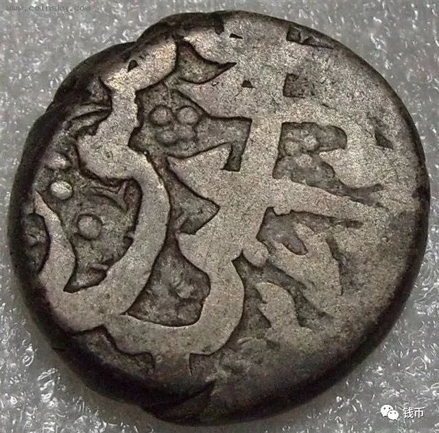 (7)喀什小银元 ,喀什造小银元,系宣统三年(1911年)铸,分叁钱、二钱两种面值。其中叁钱银圆正面为汉文“银圆叁钱”,中心有大花;背面中间珠圈内为蟠龙图案,圈外下方为维吾尔文“喀什造.叁钱 回历1329年,两侧各一个小五角星。”