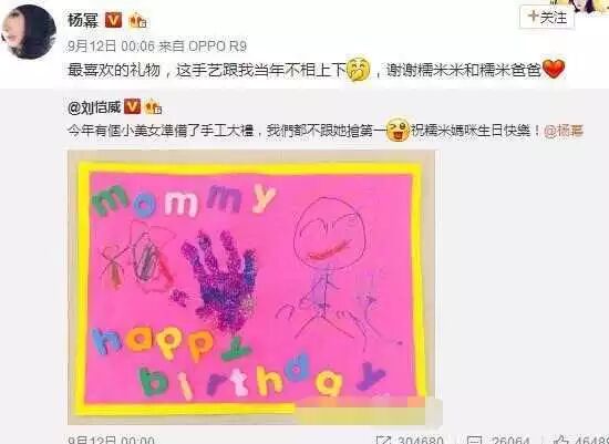 刘恺威12日零点就在微博发文:“今年有个小美女准备了手工大礼,我们都不跟她抢第一,祝糯米妈咪华诞快乐!”并附上女儿特地做给妈妈的手工卡片,而杨幂随后也转发贴文甘美回应:“最喜欢的礼物,这手艺跟我当年不相上下,谢谢糯米米和糯米爸爸”。去年我们的大幂幂华诞,刘恺威同样在第一时间送出了祝愿。