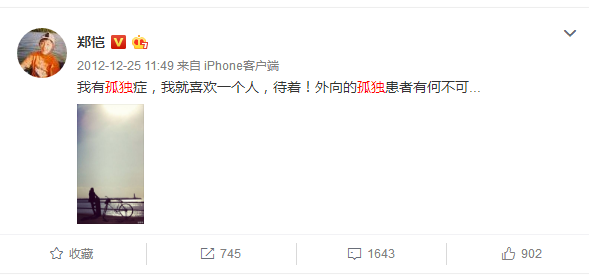 在两人公布恋情的凌晨,郑恺就发文称自己是一个孤独患者。