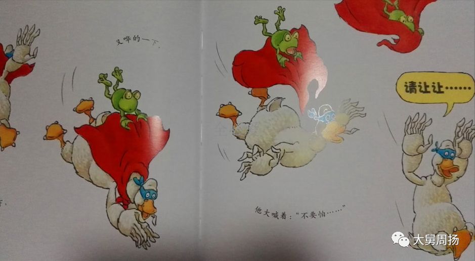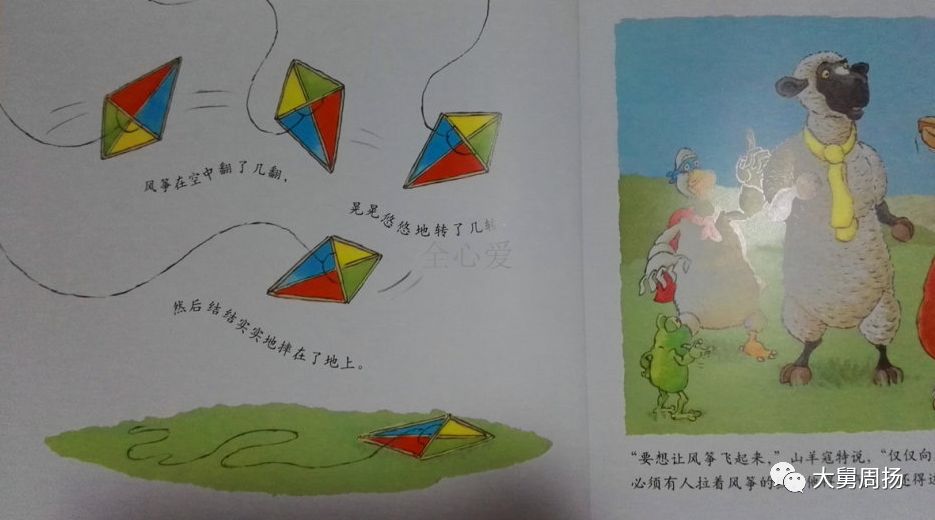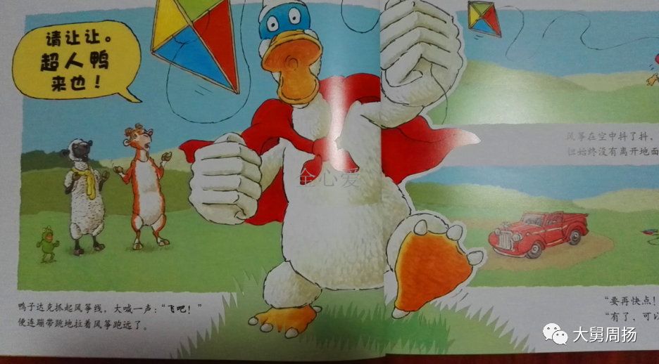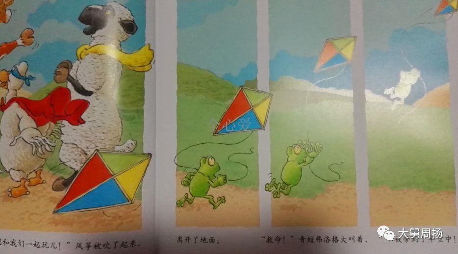 山羊寇特制作了一个漂亮的风筝,请朋友们一起来试飞。鸭子达克自告奋勇,飞跑着举着风筝往上抛。终于风筝飞上天了,大家还来不及欢呼,就发现青蛙弗洛格被挂在了风筝线上……