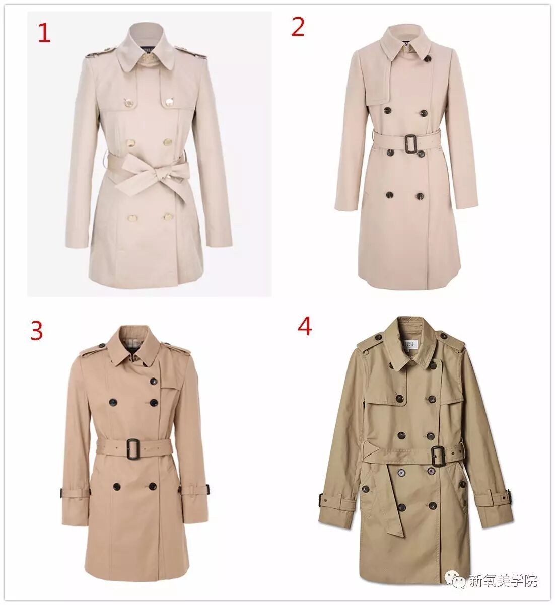 下图从1-4,庄重的感觉越来越少,气质越来越年轻。从设计的角度来说,可以看到面料的硬度越来越低,扣子的质感越来越朴实。这四件风衣就是来自一个服装集团的4个针对不同年龄层的品牌:Scofield ,Prich,E-land,Teenie Weenie.
