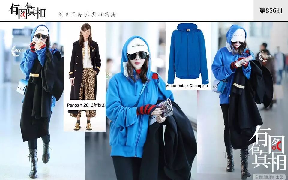 忙碌的大幂幂身穿Vetements蓝色连帽卫衣和Parosh风衣回家北京过年,时髦的孔雀蓝是吸睛必备,全身上下包裹得严严实实,这套装备很暖和!