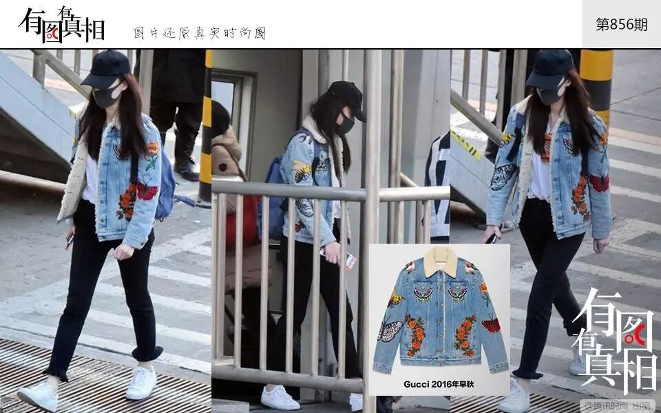 倪妮身穿Gucci刺绣牛仔外套开工,撞衫李宇春。黑色牛仔裤也来自Gucci,看似简单却满满时髦小心机,荷叶边裤脚超可爱。