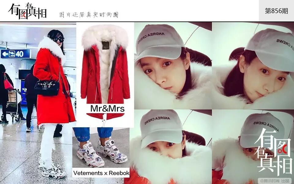 宋茜一身经典红白配现身机场,大毛领红色棉衣来自Mr&Mrs,涂鸦运动鞋是Vetements x Reebok合作款。大红色开启一年好福气!