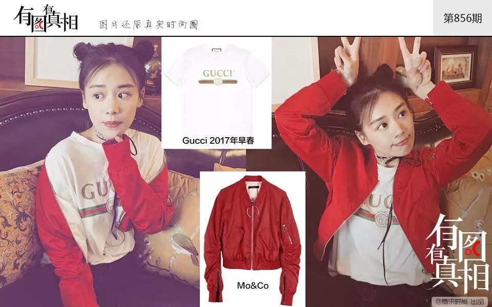 马思纯在微博晒出可爱的双丸子头造型,白色GucciT恤目测要成为今年的大热门,红色飞行员夹克来自Mo&Co。