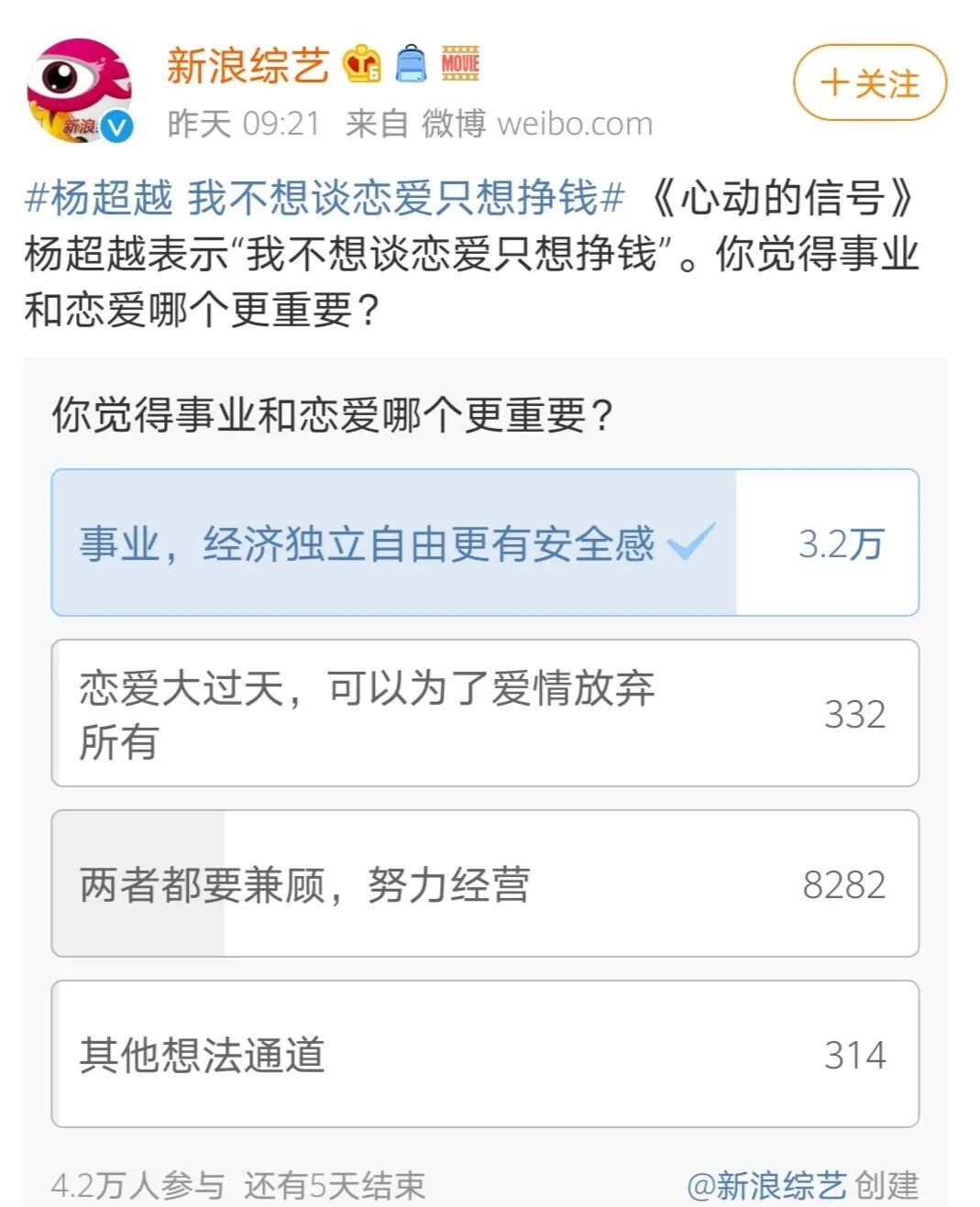 她的恋爱观又一次引发了网友热议,新浪综艺还发起了投票:
