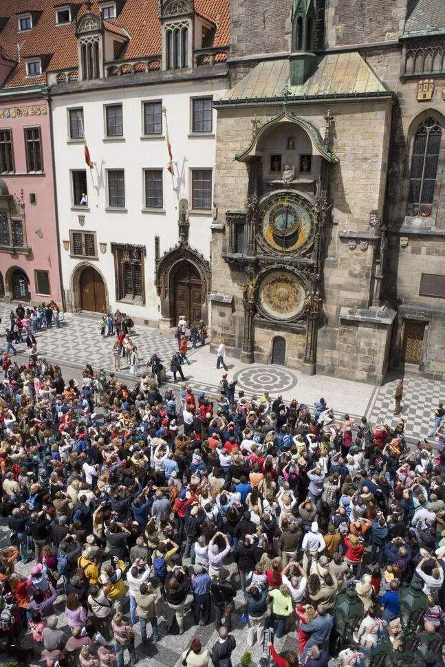 每逢整点,钟前都会聚满游人,因为十二门徒像会伴着钟声依次现身,非常有仪式感。在这里等候准点敲钟,成了人们在布拉格的必做之事——