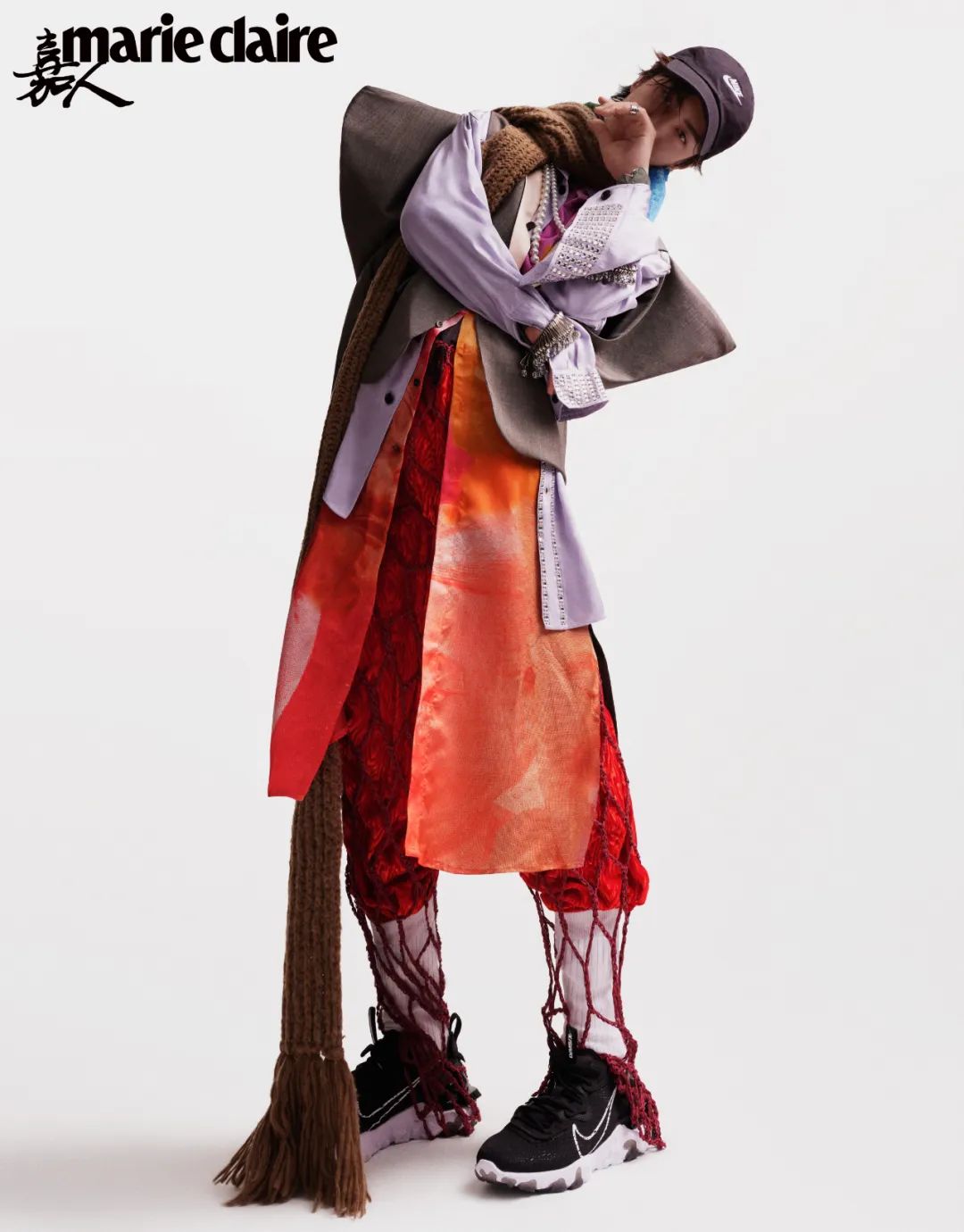白色内搭背心、白色镂空针织毛衣、银色皇冠、黑色上衣、拼接围巾 均为 TAKAHIROMIYASHITA THE SOLOIST