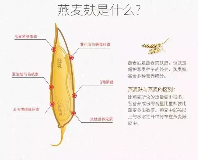 燕麦麸含有超大量的可溶性膳食纤维,一粒燕麦95%的可溶性纤维都来自于燕麦的外皮。同时还含有维生素B1、镁、磷、锰、硒等微量元素和蛋白质。