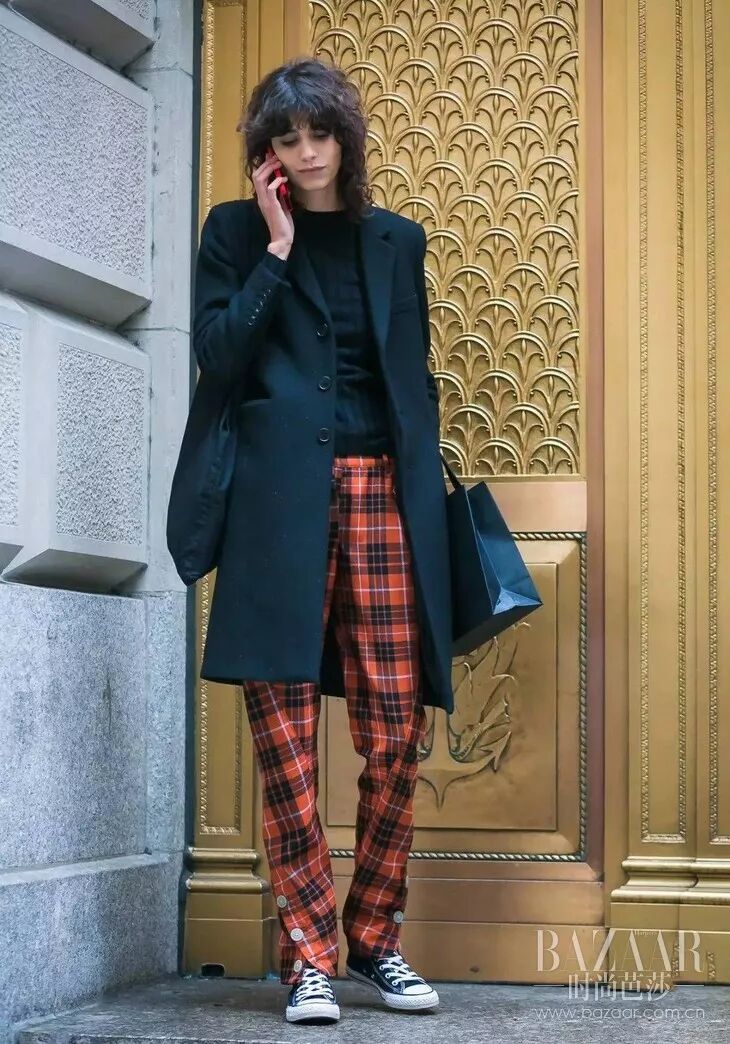 各路时尚达人也没错过格纹裤的这股风潮,Kendall用它来搭配不规则牛仔外套。Kaia用来搭配简单的黑色外套,复古又时髦,是整个造型的点睛之笔。