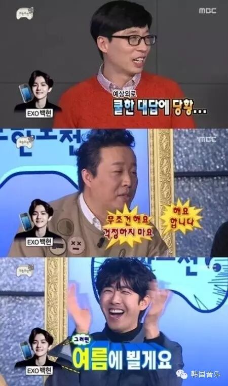"刘在石与EXO共同完成公演"也成功成为节目中观众们最为期待的任务,当时与EXO成员伯贤通过电话,得到了EXO将在夏天回归的消息。这次EXO回归,刘在石是否能够合流,并与其共同完成公演的任务引发观众们的期待。