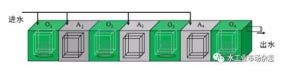 改进型分段进水多段A/O技术采用多级A/O串联的方式。技术采用生物膜法,能够适应农村污水水质水量变化大的特点,且省去污泥回流泵。多点进水的方式利用反硝化作用降解COD,节省曝气能耗,提高TN 去除率,同时“削峰填谷”,降低原水冲击。