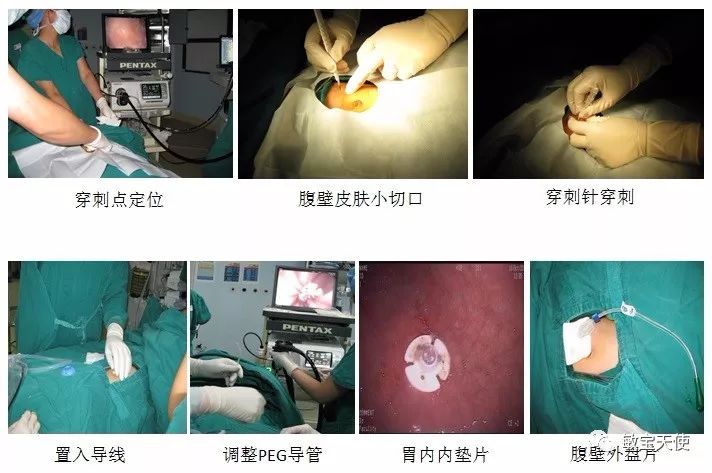 这个宝贝采用的是经典拖出法:胃镜经口-食管进入胃内,轻柔注气使胃膨胀,于左上腹光点最亮处,用手指轻压腹壁,定位并标记穿刺点。消毒皮肤,于穿刺点切开皮肤约0.5cm左右。内镜直视下,穿刺针经皮肤切口进入胃内,退出针芯,于外套管内置入引导线。活检钳通过胃镜钳取导线,随胃镜一同退出至口外。连接PEG导管与引导线,在前腹壁牵拉引导线,使PEG导管经口-咽-食管到达胃内,并穿过腹壁切口拉出至腹外。拉紧PEG导管,使胃壁与前腹壁紧贴以防出血,固定PEG导管的腹壁外盘片。胃镜检查PEG导管位置,确认局部胃粘膜无发白。