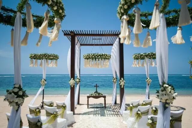 异国香花和一望无际亮闪闪的印度洋在落日余光的映衬下为极妙的巴厘胜地婚礼提供了一个梦幻般的背景。