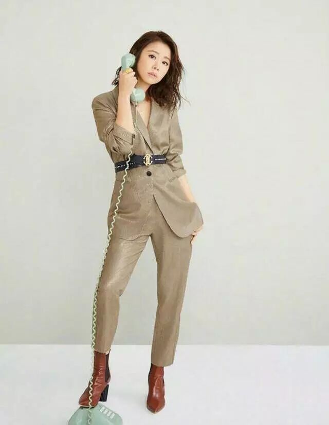 这是一套西装套装,灰色的西装其实是一种不抬肤色的颜色,林心如本身皮肤就白皙光滑,保养的十分到位,这一身造型的定位是复古范儿,看上去非常适合林心如,时髦又漂亮。一头小卷发披肩,脚上踩着高跟短靴,气质和气场都非常强,手持电话的凹造型,十分有范儿。还有这双鞋也非常有特色,鞋跟并不是完全和鞋底连接在一块儿,看起来也是一种新时尚啊!