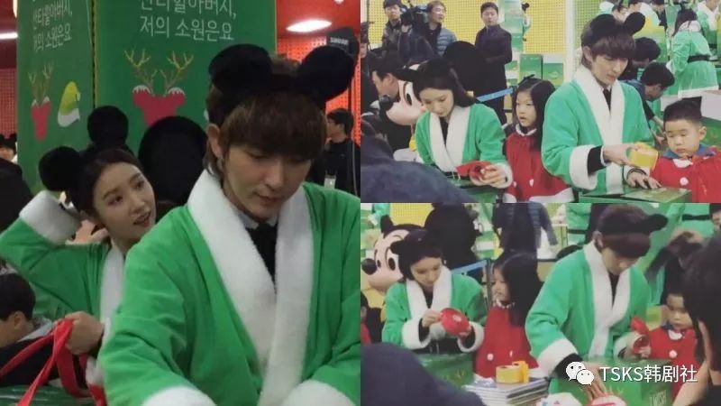 李准基、申世景在现场亲手包装送给弱势儿童群体的圣诞礼物。 还和米奇老鼠击掌互动、一起比心给媒体拍照等等。