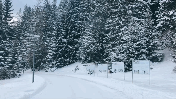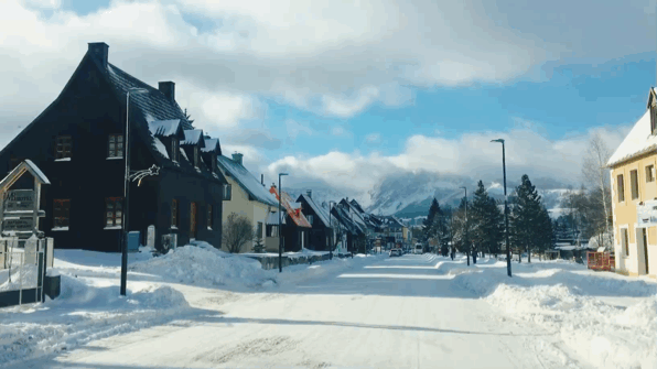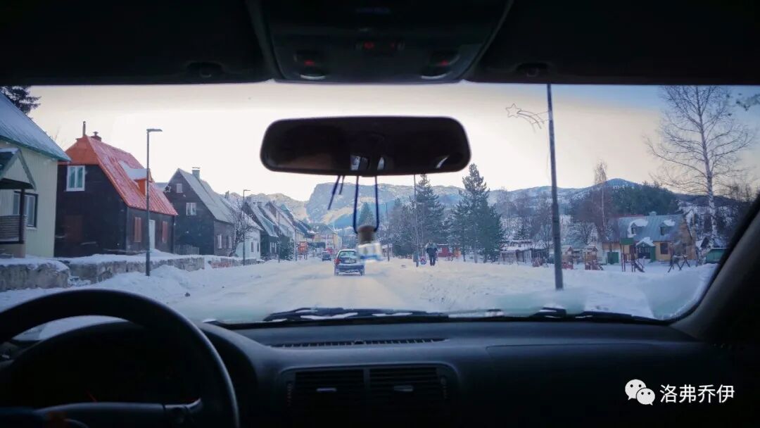 寒风刮起漫天大雪,整个冰雪世界变得千篇一律又不乏味。一座座可爱的彩色小房子在白雪覆盖的山坡上,有时还能看见开着彩色铲雪机的工人正在努力把路上多余的雪铲开。公路旁的山被堆积了厚厚一层雪,表面光滑得像奶油般细腻,在阳光下还闪闪发光。