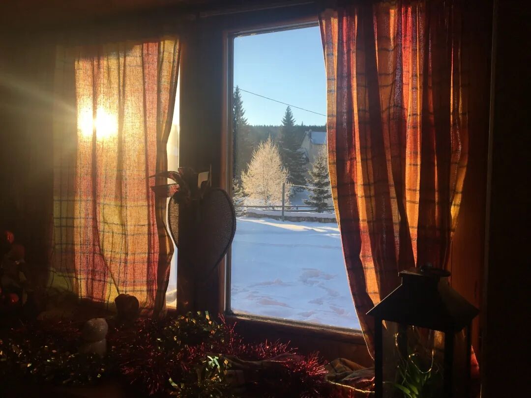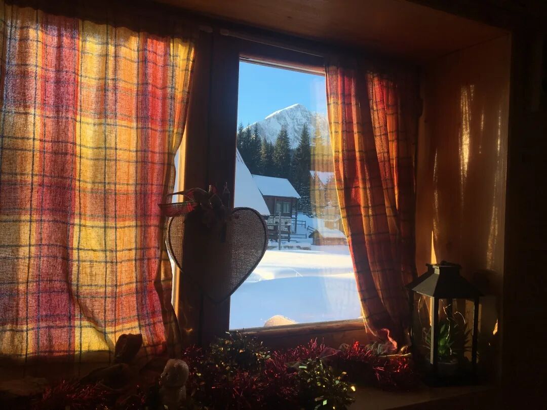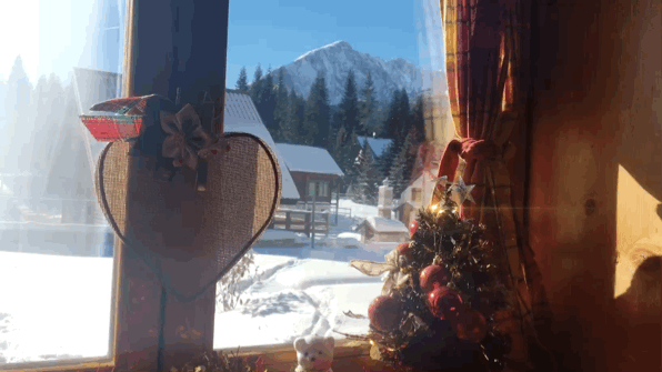 由于圣诞节的缘故,民宿的窗前多了些圣诞树与彩色装饰,餐桌上还摆放了小糖果与精心准备的水果。我们都最爱房子里的那一扇窗,拉开红色格子的窗帘就能眺望到远方的雪山。