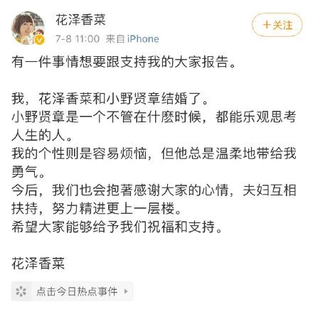今天中午,花泽香菜在微博突然发文,宣布与声优小野贤章结婚,很快被顶上了热搜。