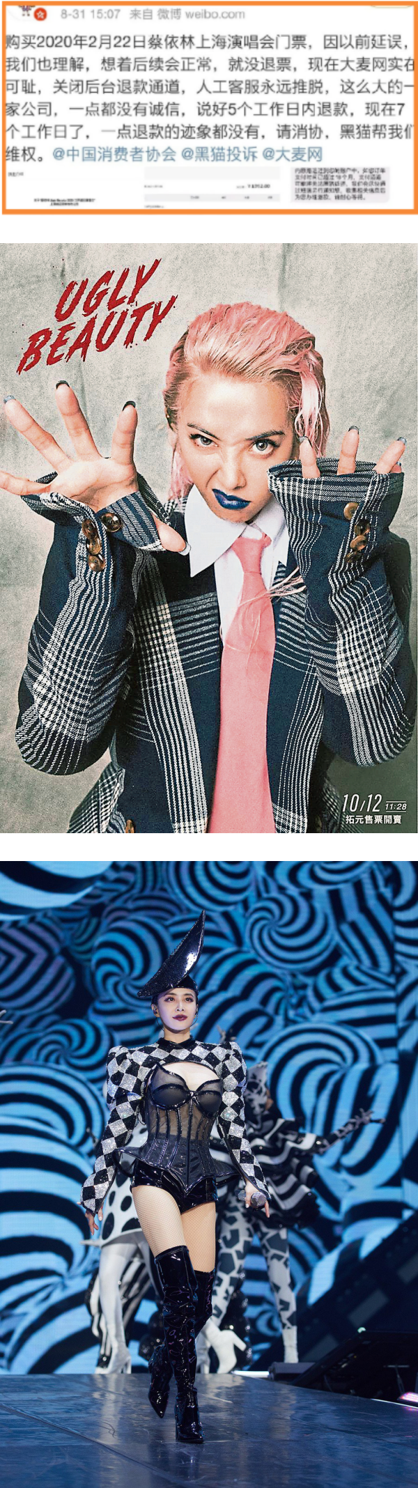 歌手蔡依林在2019年年底官宣开启“Ugly Beauty 2020”世界巡回演唱会计划,不料多数场次因为疫情关系宣布延期。有网友爆料曾购买2020年2月的上海站演唱会门票,想退票时却发现退款通道已被关闭,客服的态度也永远推脱。