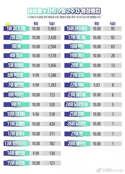2~10位分别是朴智旻3428,金泰亨2504,田柾国1578,河成云1456,朴志训1348,黄旼炫1283,朴佑镇723,金硕珍528,李大辉518。