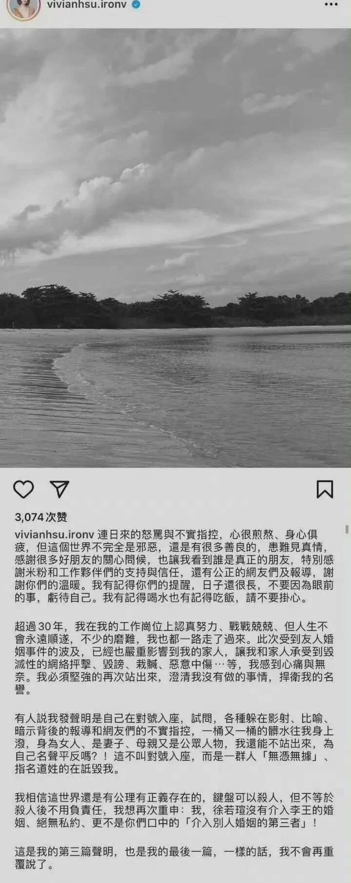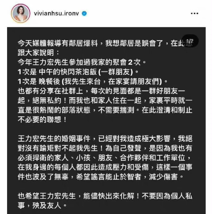 徐若瑄ins发长文:没有介入李王的婚姻,绝无私约,不是第三者 偶像说 港台女星 2021-12-22 19:23:47 911 创作不易,用心坚持,欢迎请BaGua喝几杯爱心咖啡!打赏并支持本文 打赏并删除本文 12月22日,徐若瑄更新ins,发布长文回应了王力宏和李靓蕾事件。首先,她感谢了在此次风波中给予她关心和安慰的人,说让她明白了什么是真正的朋友。其次,她表明再次站出来澄清的原因,是因为友人婚姻事件波及到自己的家人,让家人成熟了恶意中伤,她才决定站出来捍卫自己的名誉。再次,她否认网友所说的“对号入座”的说法,称自己只是站在妻子、母亲的角度为自己的名声平反。然后,她再次重申没有介入李王的婚姻,绝无私欲约,更不是你们口中的“介入别人婚姻的第三者”。最后,她说这是最后一次声明,往后会交给司法程序处理。在此之前,徐若瑄已经回应过两次了。一次是直接交给法律,澄清自己是无辜的,另一次也发布了一篇小作文,澄清王力宏来她家里聚会的过程。徐若瑄每一次都说自己是清白的,但由于当事人没有帮她澄清,到现在还是有人质疑她的作风,无数诋毁之下,她才发布了第三篇声明,作为妻子和母亲,她极力想要维护名声,也可以理解。不过鉴于李靓蕾长文中的另一位女星没有被扒出,大家还是会把目光集中到她身上,李靓蕾先前已经帮陈建州和范玮琪澄清了风波,但唯独没有帮徐若瑄澄清,更加让徐若瑄的位置变得尴尬。虽然李靓蕾称,帮范玮琪夫妇是因为受人委托,但还是让徐若瑄的嫌疑加深了,这也是徐若瑄再发长文的原因。可惜王力宏再道歉之后,便不再发声了,徐若瑄牵扯其中,只有当事人能帮她洗刷冤屈,王力宏自身都保不住,更别提她了。如果她真的是无辜的,此次风波也挺冤的。要怪就怪她当初交友不慎,不然也没有当下的局面了。目前,王力宏在酒店,媒体进不去,也为他挡了不少风波。有与他同酒店的网友透露,他每天晚上都会拉小提琴,或者弹电子琴,声音很大,打扰了邻居的休息,还因此被投诉了。想必他本人现在心情也很焦虑,只能靠音乐来释放压力了,不过给他人带来困扰,实属不应该。另一个被此事波及的yumi,已经到了医院。yumi多次否认自己跟王力宏无关,但都被李靓蕾晒出证据,yumi陷入百口莫辩的境地。yumi的朋友站出来帮她说话,但也于事无补。还是希望小姑娘好好保护好身体,王力宏都没事,她这么伤害自己太不值得了。王力宏婚姻事件被波及的两个女生,每一个现在都焦头烂额,一方面受舆论影响,另一方面直接“社死”。yumi的发声没人相信,徐若瑄此番辩解,不知道有人相信吗? 创作不易,用心坚持,欢迎请BaGua喝几杯爱心咖啡!打赏并支持本文 打赏并删除本文 感谢您的支持鼓励,我会继续努力的!文章地址:用户邮箱:打赏金额:USDT 请输入数字点击”去打赏“,即可进行打赏支持本文章哦 徐若瑄 About the Author 偶像说 功能介绍:这里有很多个明星,但是我们最爱讲TFBOYS的事情,有关三小只的小秘密你想听嘛? Related Posts 黄子韬徐艺洋餐厅约会被偶遇,戴情侣帽秀恩爱,却互不搭理显冷漠 2023-02-15 22:40:08 伊能静带7岁女儿小米粒回台北探亲,网友:比大s识大体! 2023-02-03 23:09:13 网传TFBOYS十周年演唱会完成备案,时间跟李飞说的对上了! 2023-02-02 23:54:30 蔡少芬深夜陪老公玩穿越机,炫耀:我男人没有我不成!夫妻合照好甜 2023-01-06 23:31:16 黄景瑜工作室告黑胜诉,历时已久,终于守得云开见月明 2023-01-06 23:31:16 发表评论