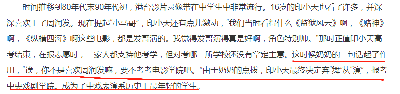 印小天的考学很顺利,凭借舞蹈拿下高分,他成了中戏94级最年轻的学生。科普一下,中戏94级还有陶虹、段奕宏、涂松岩。涂松岩说那时班里都叫印小天“小小少爷”,除了年龄小,五官标致,练过舞的人往那儿一站就特有范儿,很拔尖。