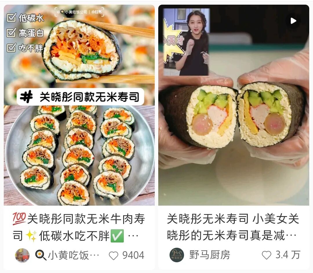 掌握了流量密码的关晓彤继续在“吃播博主”“菜谱博主”之间反复横跳,并且屡试不爽。后来,她陆续做过解馋鲜辣汤、牛油果能量蛋卷、无米寿司等,每次都能招揽一群打卡同款的网友。