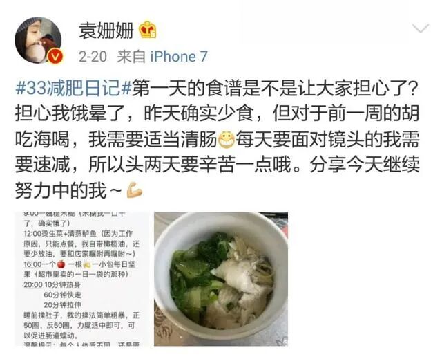 2018年的大年初三,袁姗姗在微博吐槽自己胖了六斤。为此,她立志要开辟一个“33减肥日记”栏目,请网友在线监督,一举拉开了她每天分享瘦身食谱的序幕。