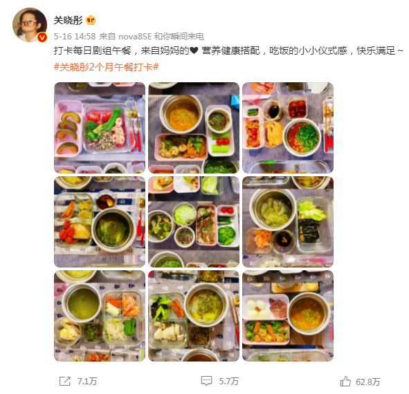 上个月,关晓彤发了一条微博,记录在剧组拍戏期间,妈妈每天给自己做的午餐。不久后,“关晓彤2个月午餐打卡”登上热搜。