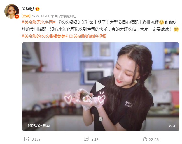 同样地,不妨看看关晓彤整个五月发的微博,内容不论是补拍毕业照、收工后的日常,还是官宣新代言、宣传世界无烟日,热度都远不及其四月底发的一条做无米寿司的微博。