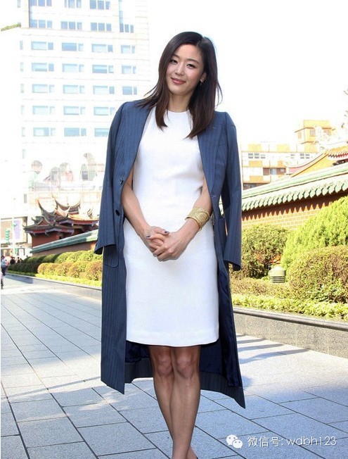 白色连身裙在明媚的阳光下格外清新,条纹款式长西装外套干练又不失优雅,金色手环作为唯一配饰增加时尚度又不破坏整体感。