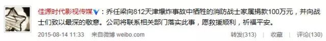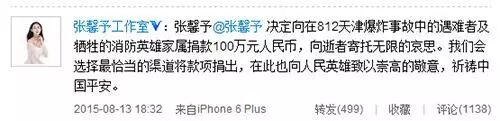 另外同样因为用词不妥遭到网友吐槽的张馨予也在昨天(8月13日)通过工作室宣布捐款:“决定向在812天津爆炸事故中的遇难者及牺牲的消防英雄家属捐款100万元人民币,向逝者寄托无限的哀思。我们会选择最恰当的渠道将款项捐出,在此也向人民英雄致以崇高的敬意,祈祷中国平安。”