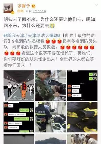 天津塘沽爆炸一事牵动人心,灾难面前,明星作为正能量表率发声、祈福,本来是值得嘉许。但昨日乔任梁、张馨予等的表态,却让主题跑偏。原因是,乔任梁居然用“飞蛾扑火”、“自取灭亡”来形容消防队员,还动员大家“人肉”出英雄们、记住他们的模样;而张馨予则转发消防员照片直接表示“明知去了回不来,为什么还要让他们去”……两人的发言让网友直呼智商感人。