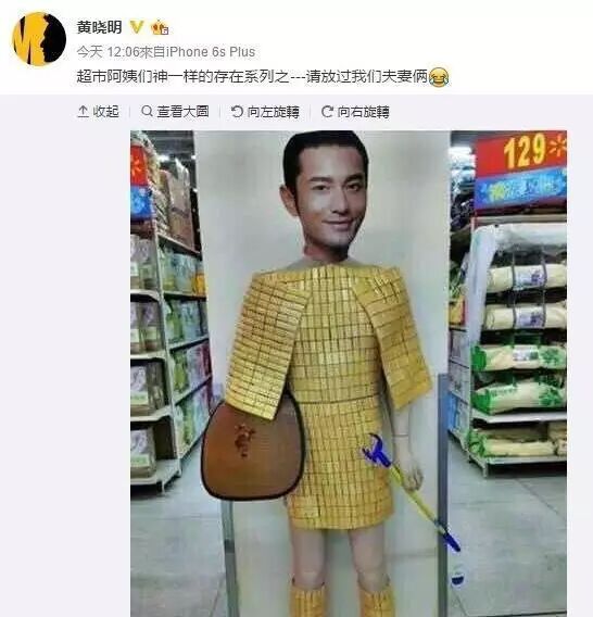 黄晓明 24 日在微博上传 2 张照片,发文写道:" 超市阿姨们神一样的存在系列之请放过我们夫妻俩。" 原来是他的照片被超市加工变成宣传模特儿,一颗大头下接着儿童人体模型,而且还被扒光衣服穿上竹片做成的 " 黄金甲 ",看上去十分滑稽,也引网友笑回 " 你们夫妻真的是阿姨们的最爱 "。