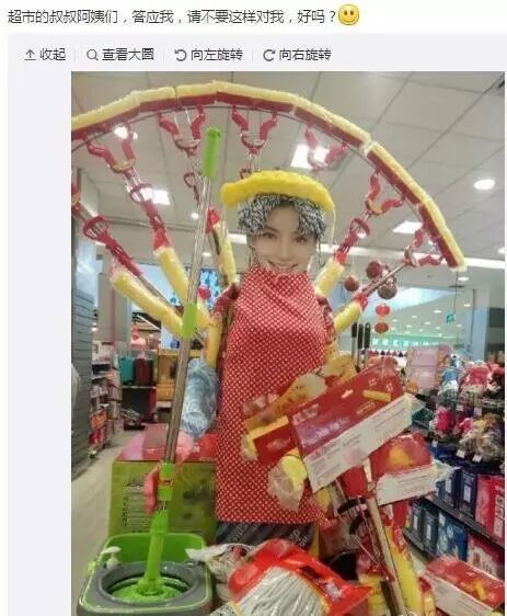 事实上,Angelababy 先前也曾被拿来当超市的 " 拖把代言人 ",她不但被围上围裙组装成 " 波霸主妇 ",最惊人的是头上用吸水海绵加上拖把布做成头巾和头发、背后还插上 7 根吸水拖把,前方也都放满了各种清洁用具促销,画面超级爆笑,让她不得不求饶:" 超市的叔叔阿姨们,答应我,请不要这样对我,好吗?"